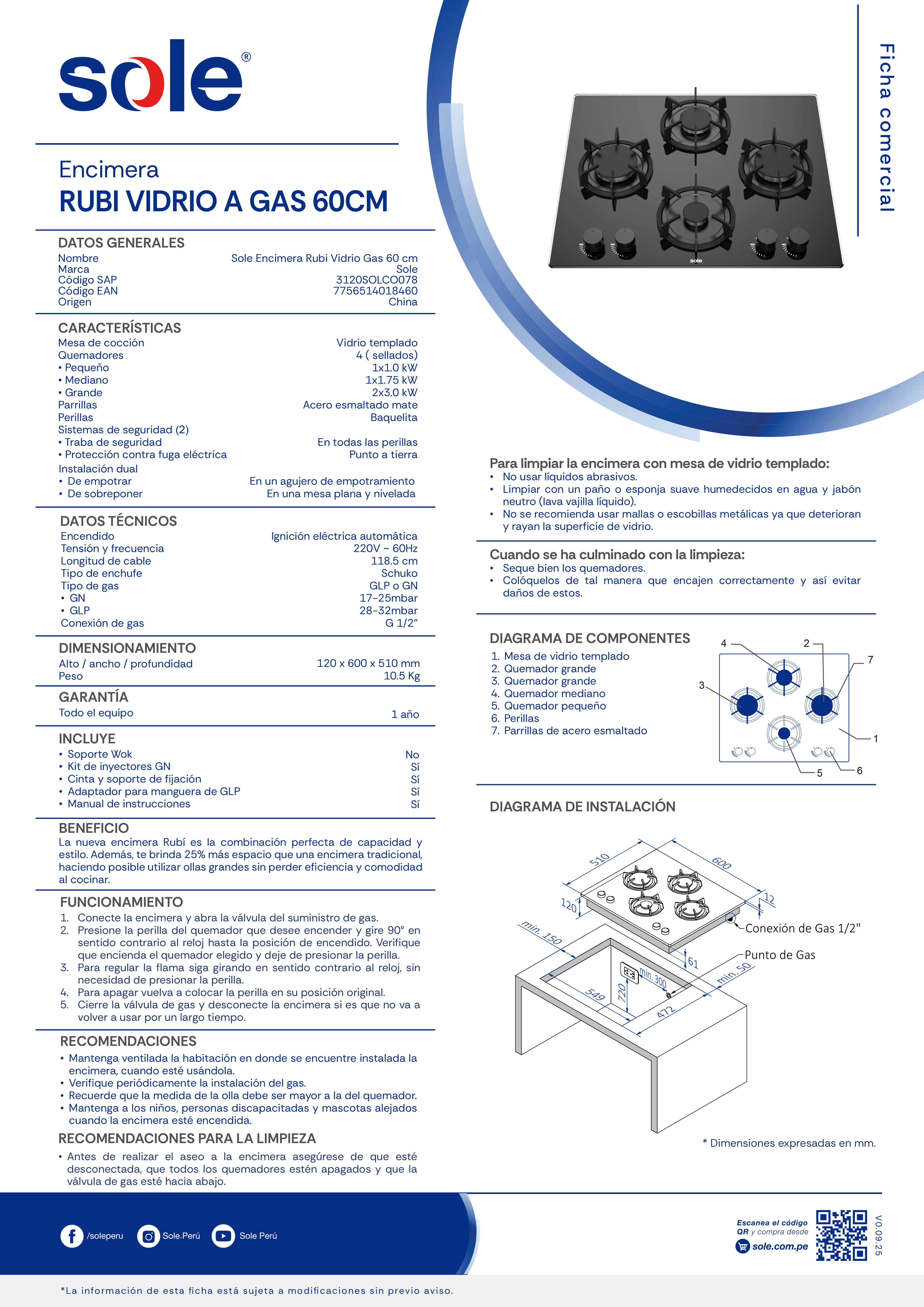 La nueva encimera Rubí es la combinación perfecta de capacidad y estilo. Su diseño patentado e innovador realzará el look de tu cocina para disfrutes de un espacio moderno y perfectamente organizado. Asimismo, te brinda 25% más espacio en el que podrás cocinar con mayor comodidad y eficiencia. La encimera te permite colocar hasta 4 ollas a la vez, para que así ahorres más tiempo haciendo tus recetas. Su mesada de vidrio templado, además de su elegancia, facilita su limpieza. ¡Transforma tu cocina siempre con Sole!